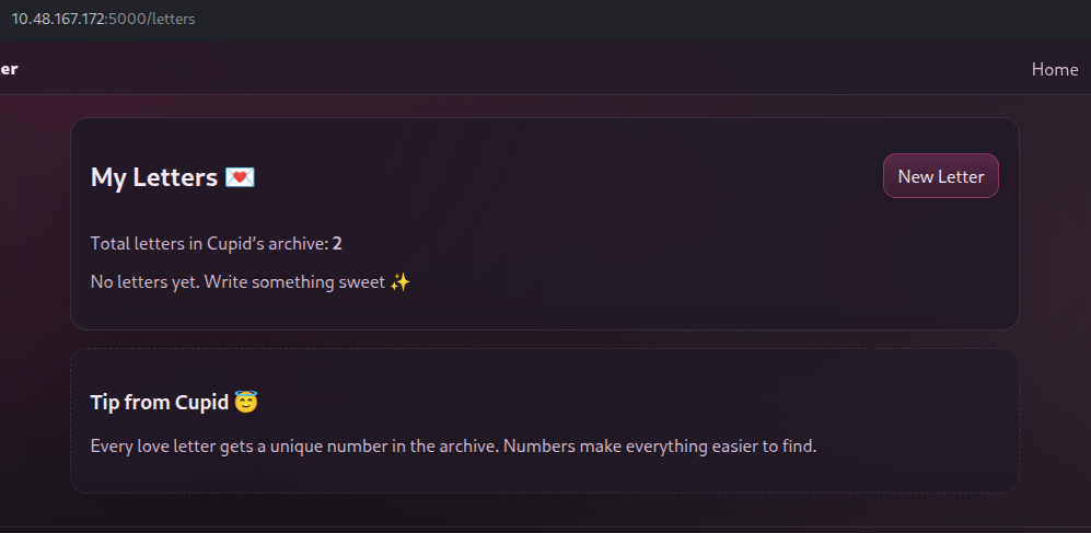 Before trying anything else, I registered an account and logged in as a normal user. The app says that total 2 letters are stored in archive and each letter gets a unique number: