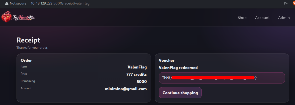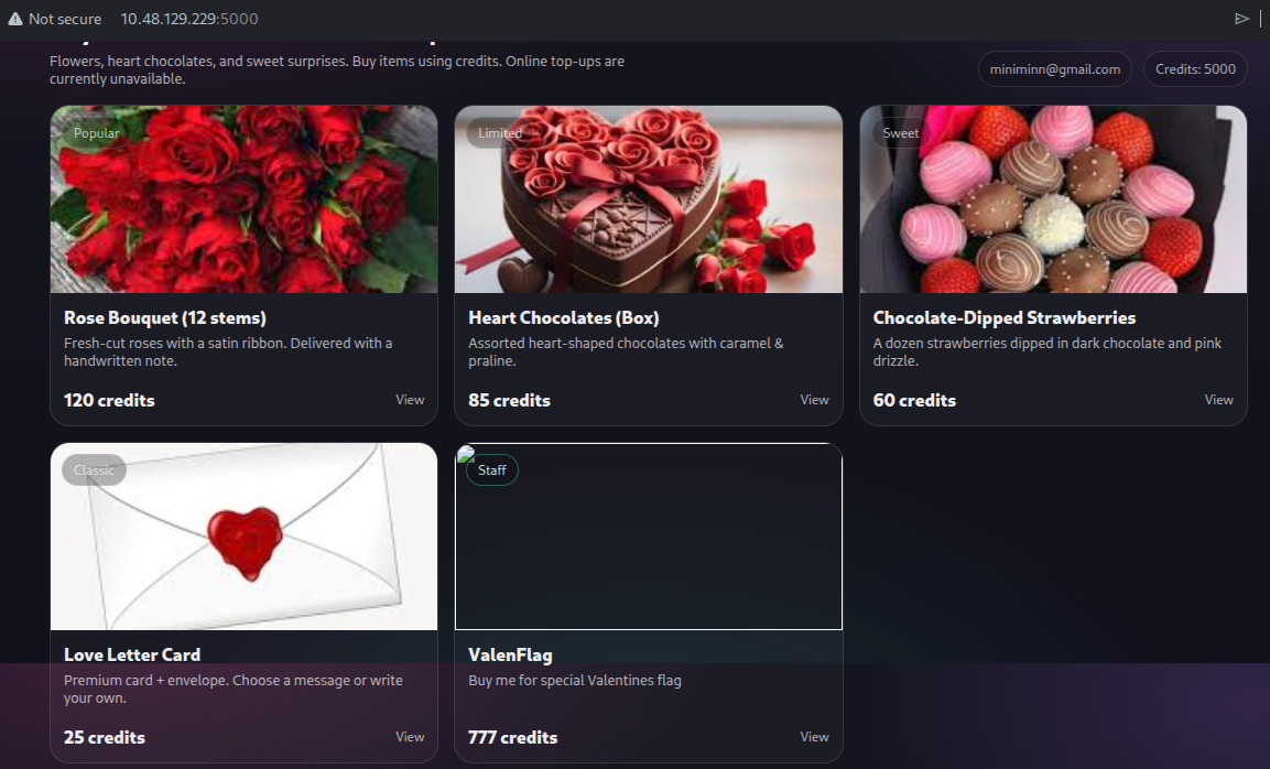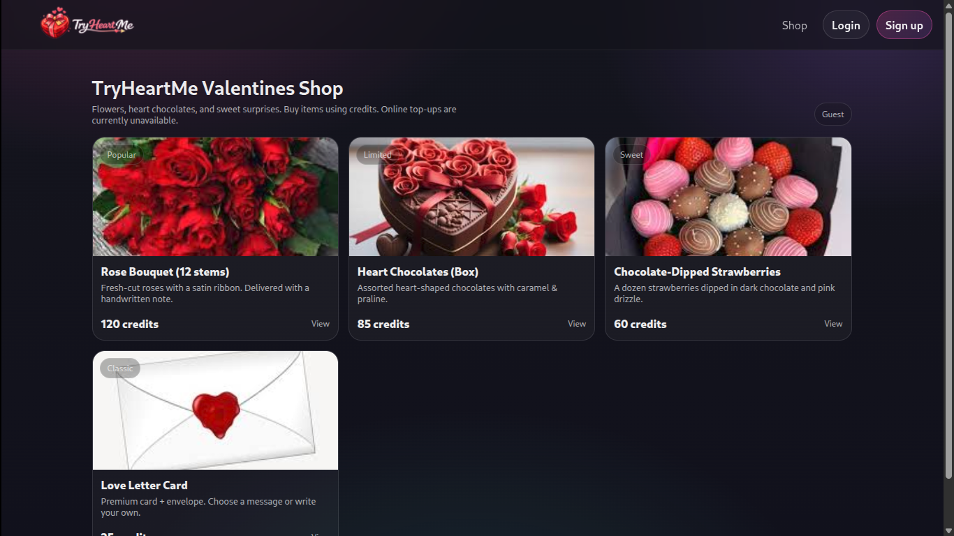 Dear Hacker, The TryHeartMe shop is open for business. Can you find a way to purchase the hidden “Valenflag” item?