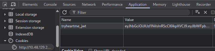 With this tampered cookies, I entered it to DevTools > Application > Cookies and refreshed the website: