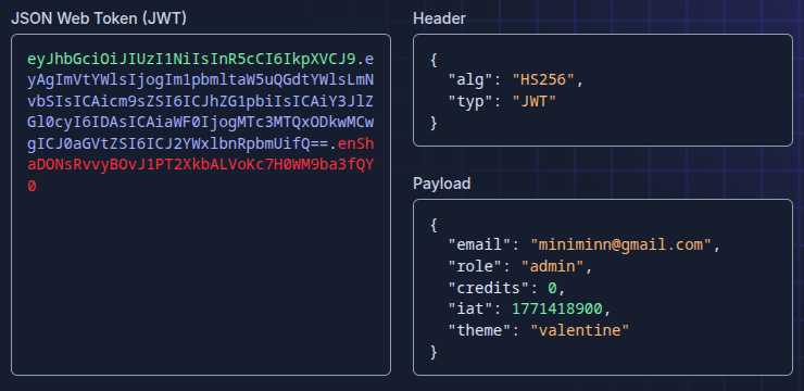 I copied this JWT (JSON Web Token) cookie and opened it up on JWT Decoder. When we inspect the cookie, there’s a role field: user. So, I directly change it to admin: