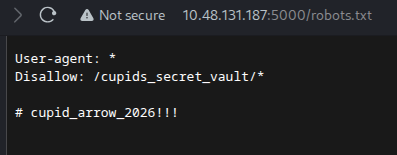 It found a new path, I opened that URL path /cupids_secret_vault/administrator and entered credentials as shown previously (robots.txt):