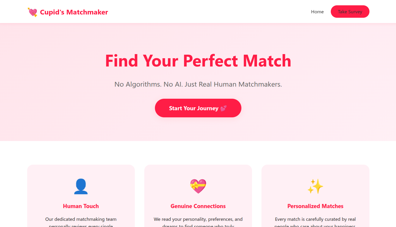 Tired of soulless AI algorithms? At Cupid’s Matchmaker, real humans read your personality survey and personally match you with compatible singles. Our dedicated matchmaking team reviews every submission to ensure you find true love this Valentine’s Day! 💘No algorithms. No AI. Just genuine human connection.